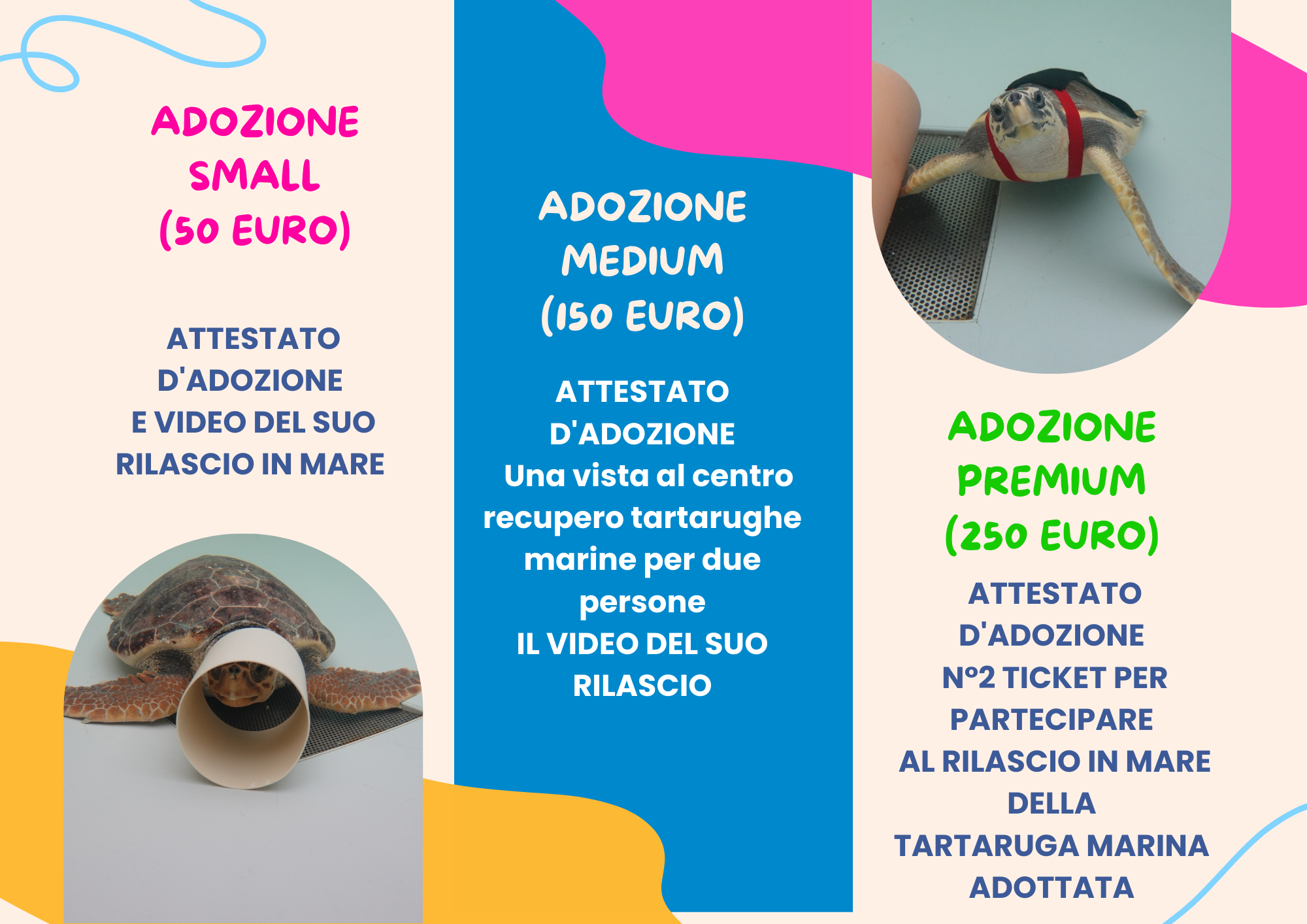 Contribuirai alle spese per le cure, le analisi veterinarie e le terapie della paziente, per rimetterla il più presto possibile nel suo ambiente. Scegli il pacchetto che preferisci.